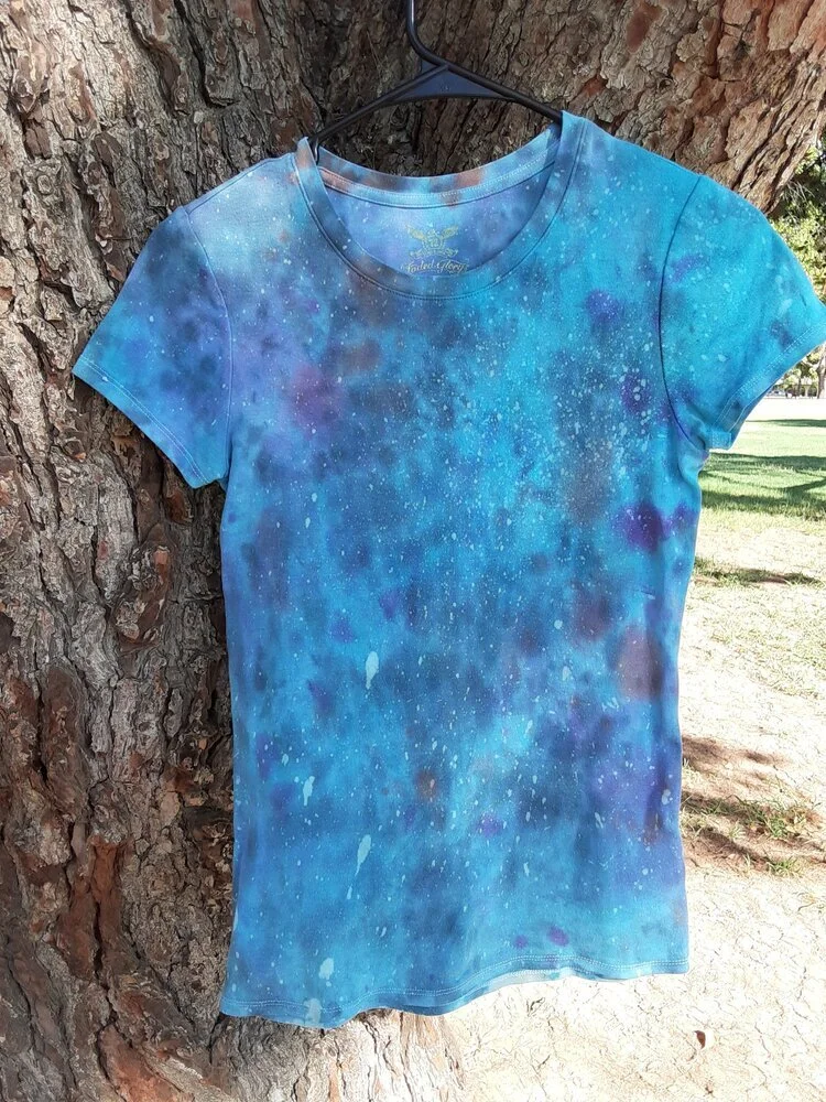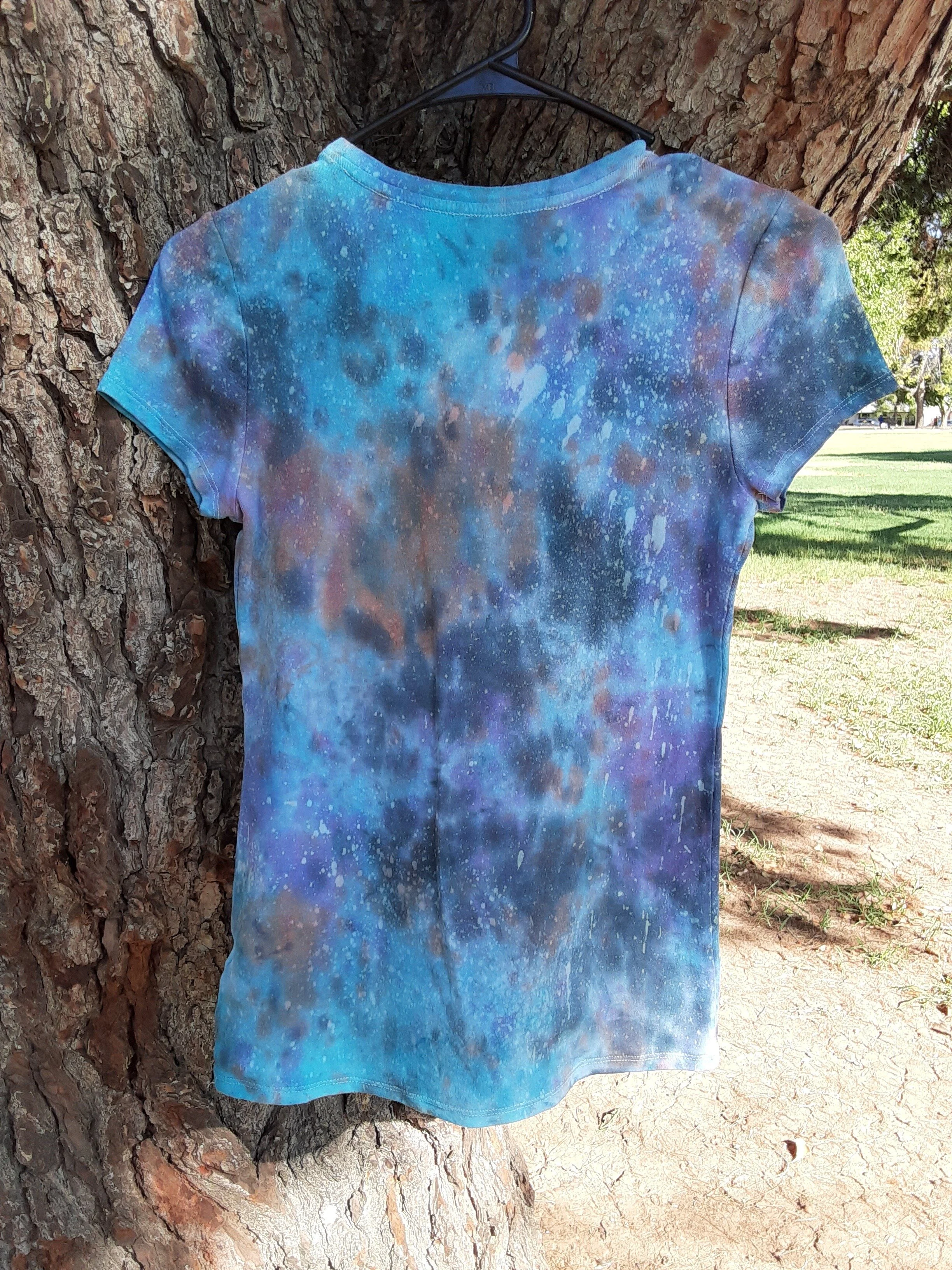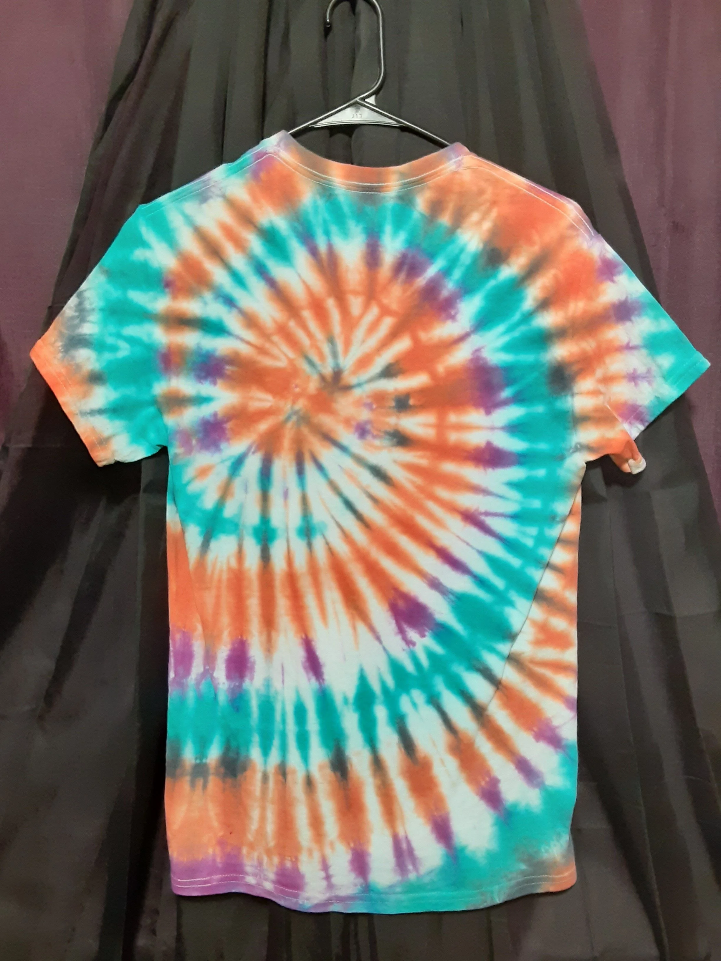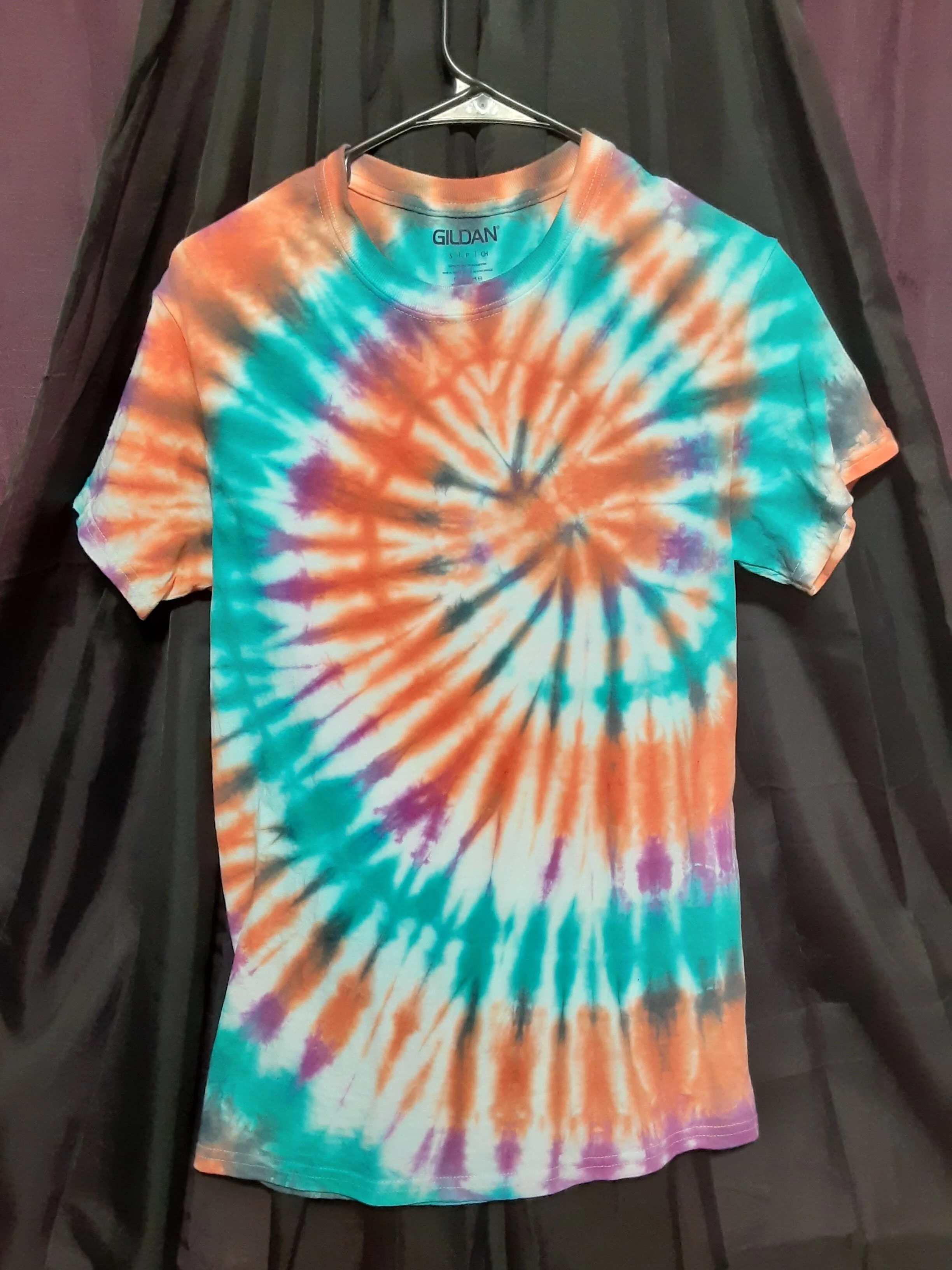 Hand dyed short sleeve shirt with shades of red and orange. 60٪ cotton 40% polyester, youth large